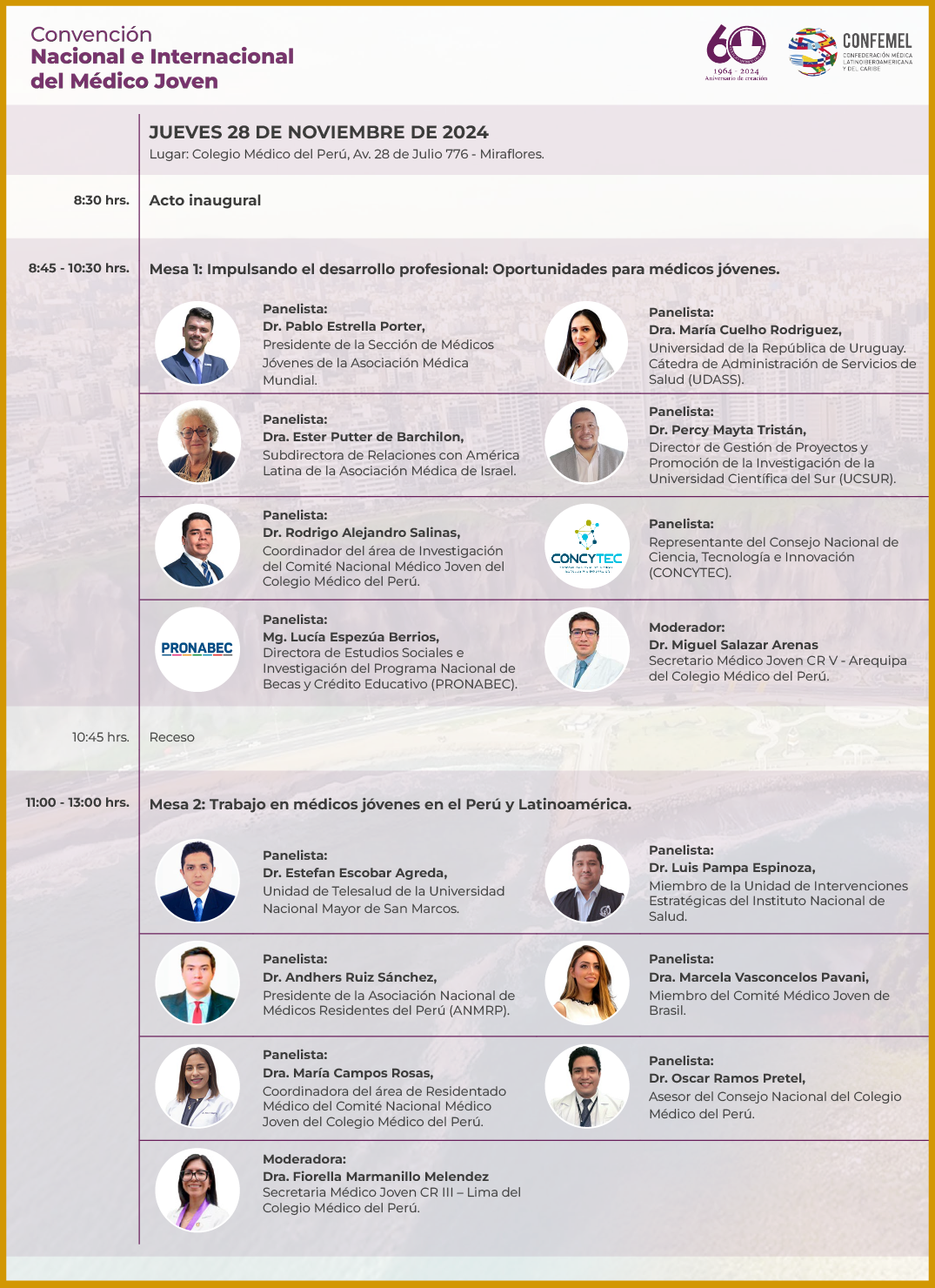 Esta mesa de trabajo está diseñada para identificar las barreras que enfrentan los médicos jóvenes en su desarrollo profesional y generar estrategias efectivas para superarlas. Se discutirá cómo el Colegio Médico del Perú puede actuar como un facilitador para la capacitación, investigación y la expansión de redes internacionales. Los participantes aportarán propuestas concretas que promuevan la excelencia, calidad y equidad, con el fin de empoderar a los jóvenes médicos y mejorar sus oportunidades en un entorno competitivo y en constante evolución