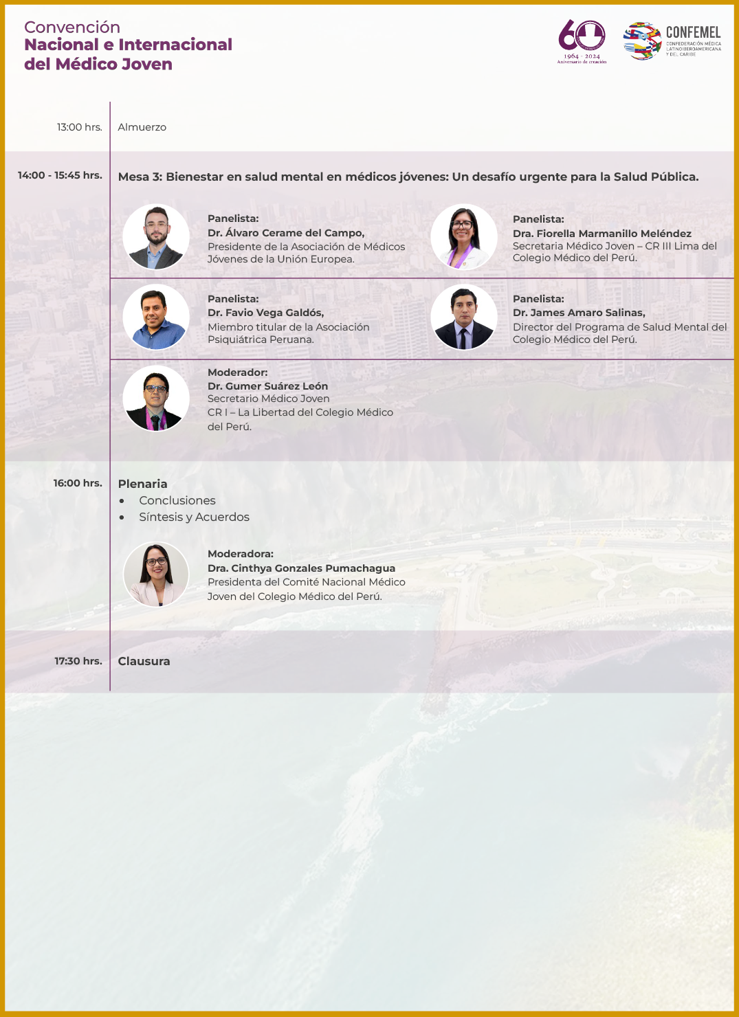 La salud mental del médico joven es fundamental para su bienestar y para la calidad de la atención que brindan. En esta mesa, se discutirán los efectos de la violencia, el acoso y la presión laboral sobre la salud mental de estos profesionales, además de proponer redes de soporte efectivas y políticas reguladoras desde la experiencia nacional e internacional. El objetivo es crear un entorno que promueva su bienestar integral, prevenir los riesgos y generar mecanismo de soporte para los casos identificados.